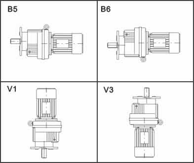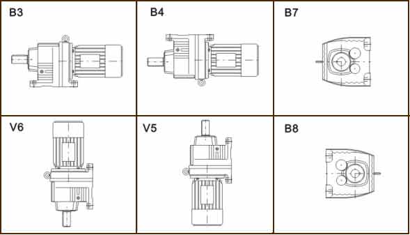 HR-47-67,6-20.7-B3-0.55HR - серия;47 - типоразмер;67,6 - передаточное число;20,7 - частота вращения выходного вала (об/мин);B3 - монтажная позиция;0,55 - мощность электродвигателя.Монтажные позиции HR